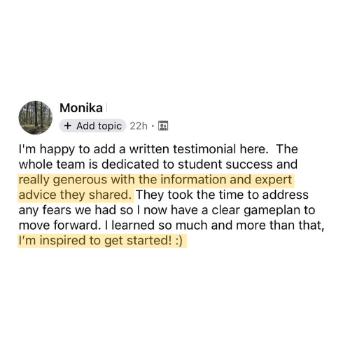 * Individual results are not typical. Background, education, and effort may affect your experience. Information is shared as examples and not a guarantee. Your results may vary.